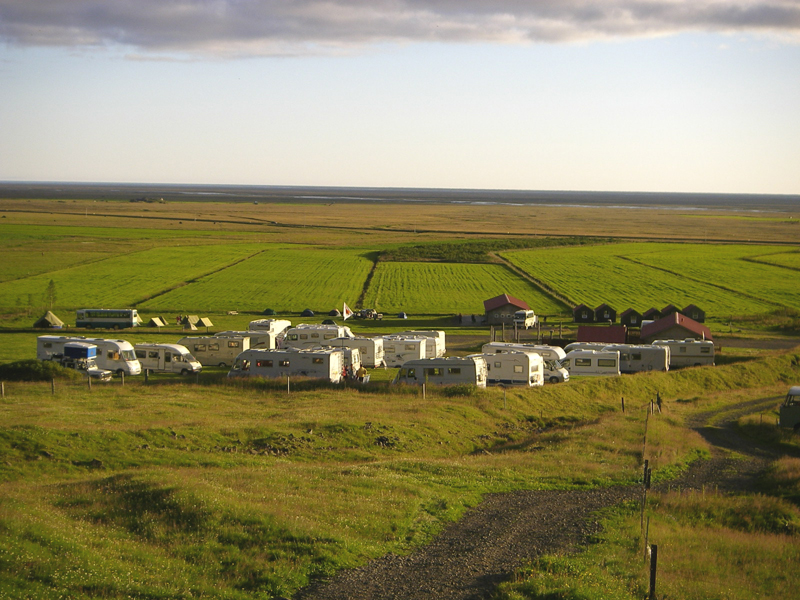 Hópur húsbíla á tjaldsvæðinu ofan við sundlaugina