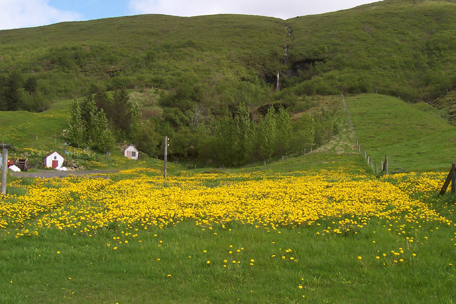 A field of dandelions beneath the ravine "Bæjargil"